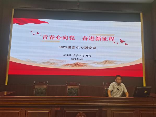 学院党委书记马涛宣讲了《青春心向党奋进新征程》的专题党课。党课聚焦中国人民抗日战争暨世界反法西斯战争胜利80周年、百年党史等重大事件和重要节点,立足法学专业学习,结合丰富生动的事例,围绕“立足历史节点、厚植家国情怀”“选择法学,就是选择与党同行的法治事业”“如何为成为一名党员做好准备”而展开。马涛书记勉励学院新生坚定理想信念、捍卫公平正义、推进良法善治,将“小我”融入“大我”,在理论学习中筑牢思想根基、在追求学业卓越中练就过硬本领、在投身实践中践行为民初心、在考验锻炼中规范言行举止,积极向党组织靠拢,为成为具有深厚家国情怀的新时代“法律人”而不懈奋斗。